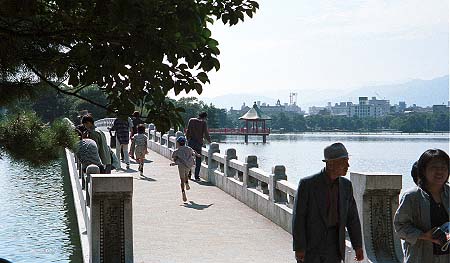 この公園は福岡市の代表的な公園で池の周囲は2kmあります池の中に島が三つあり四つの橋で池を二分しています。 周囲には喫茶店や美術館・武道館・日本庭園・能楽堂などが あり歩道が池を1周していてジョギングを楽しむ人や橋を渡りな がら散策をする人、景色を眺める人など、終日人の集まる カルチャータウンといったところです。 この池はもとは博多湾の入り江を利用して造られた福岡城 の外堀です、福岡城址は隣の舞鶴公園にあります一つの 公園を大濠公園と舞鶴公園に二分して呼んでいるような ものですから周囲が4km以上ある巨大な公園が都心部 あることになります。 |