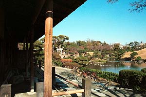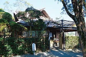 この建物は京都御所に建っていたものを約四百年に移築したものです、名前の由来は 初代細川家の細川藤孝公が、八条宮智仁親王に古今和歌集解釈の秘訣を伝授され たことによるものです。 今では、お茶を飲みがら庭を眺めることができます。 当時の武将は、政治家と軍人のほかに文化人としての顔を持っている方が多いようです。 |