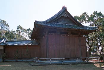 写真左 稲荷神社 1809年に京都の伏見稲荷 から勧請したものです。 写真上 能楽堂 本座、新座、夏祭新能など が上演されます、この堂は西日本有数の名舞台 と評されています。 |