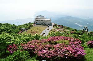 鶴見岳は山頂までロープウエイで登ることが できます風光明媚な眺めを楽しめるところで季節折々 のみものがあります春は桜が咲き初夏にはミヤマキリ シマが咲き誇り、夏には夜景、冬には霧氷と目を楽し ませてくれます。