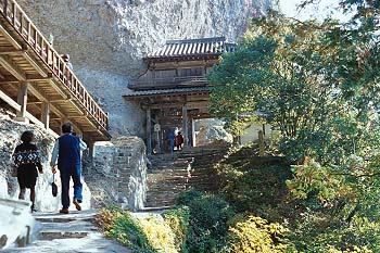 羅漢寺山門 岩肌にくっ付いて山門が立っています ここのお寺の雰囲気は、おどおどろし さがあまません。 それは江戸時代東照宮(徳川家康) をまつり三葉葵の紋章と十万石の 格式許をされたことによるものでょう。 |
